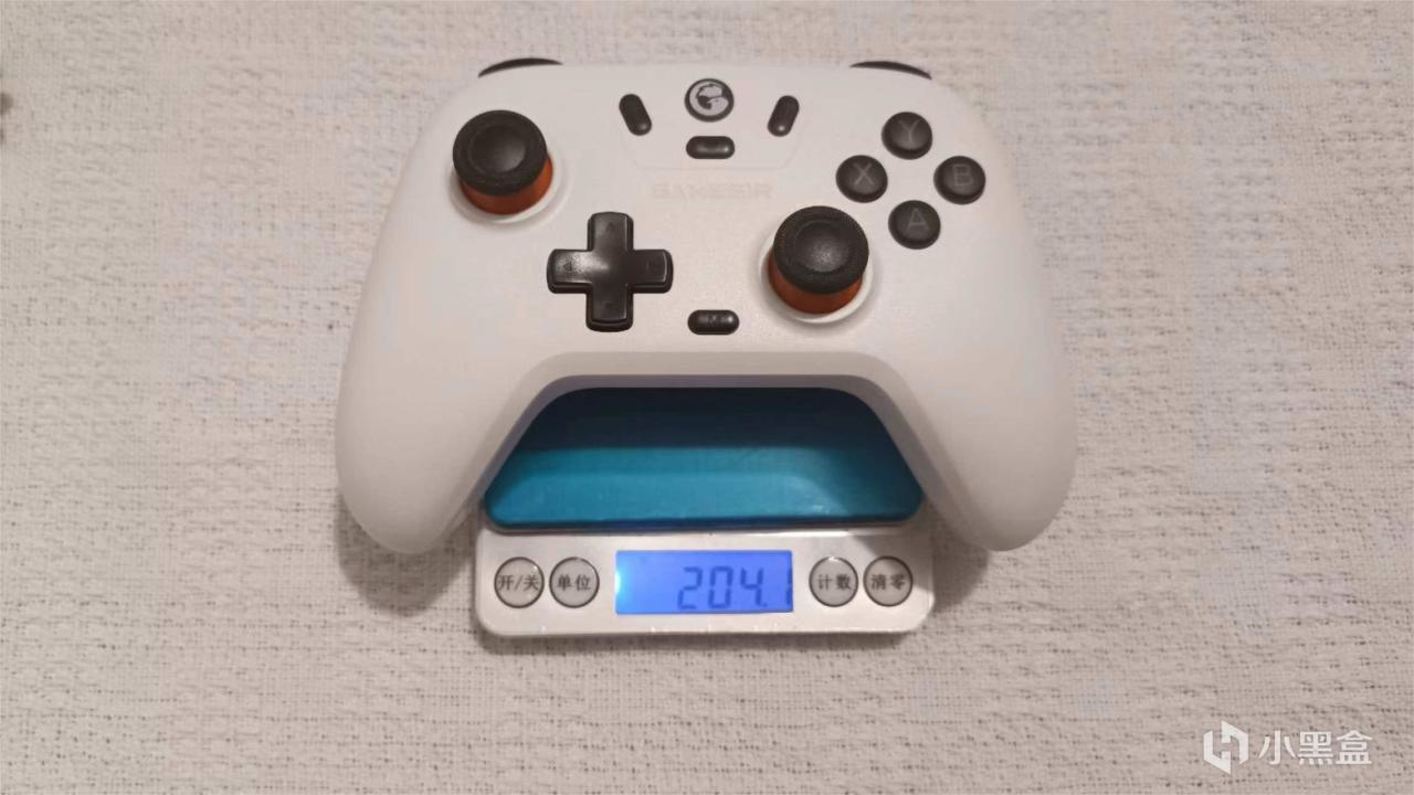 手柄的重量为204g,使用后可以感觉到重量合适,长时间使用也不累,也有足够的质感。手柄背面有防滑纹路,可以增加摩擦力防止手在游戏过程中打滑,防止手因长时间出汗而卡住,可以更好地满足玩家长时间手持游戏的需求。